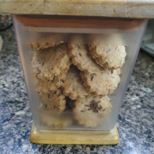 This is a cookie topped with roasted cumin seeds. Tastes yummy with your evening tea or coffee!