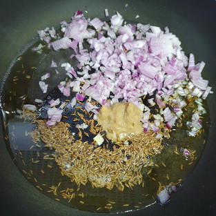 In a pan take 1 tbsp butter, add the cubed onions, green chillies, ginger garlic paste and sauté till translucent